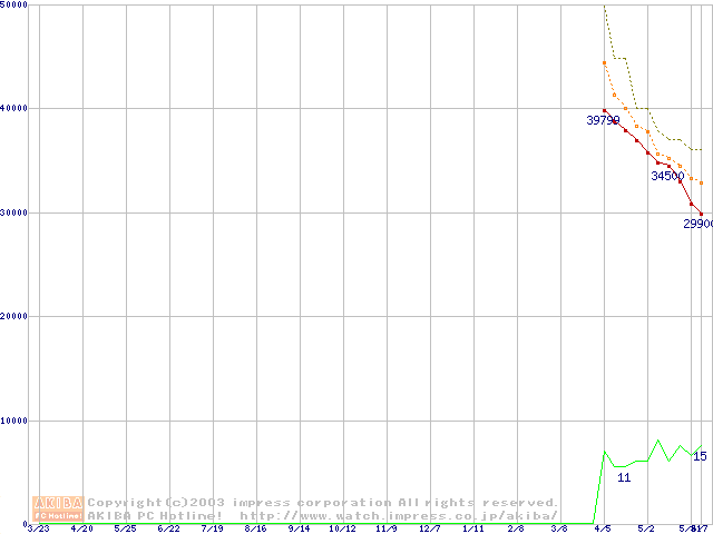 Travelstar 80GN (9.5mm,4200rpm,UltraATA/100,8MB,FDB,40GB/Platter)の最安値推移