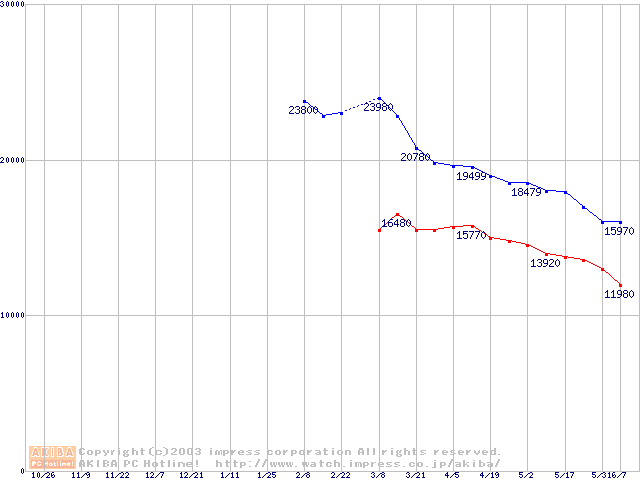 | [↑前グラフ]: | Barracuda 7200.7 (7200rpm,UltraATA/100,2MB,80GB/Platter,FDB)の最安値推移 |