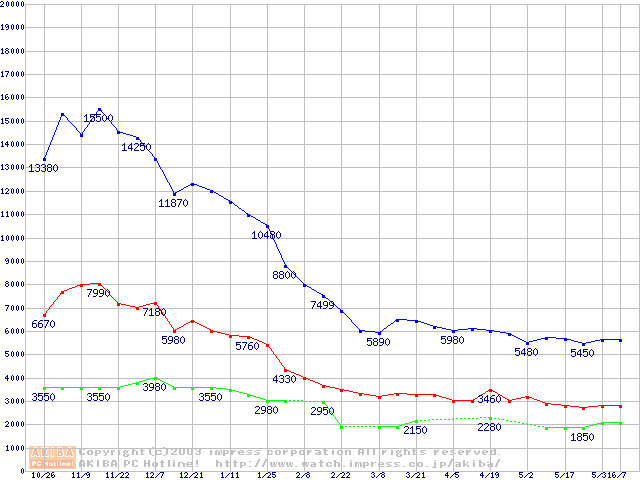 | [↓次グラフ]: | PC2100(DDR266) DDR SDRAM DIMM ECC対応 Registeredタイプの最安値推移 |