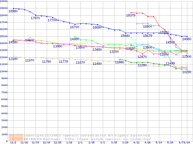 | [↓次グラフ]: | 2.5インチHDD主要製品(最安値1万5千円~2万円未満)の最安値推移 |