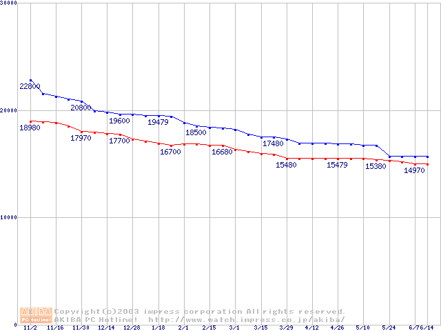 | [↓次グラフ]: | 2.5インチHDD 60GB~80GB未満(9.5mm厚)の最安値推移 |