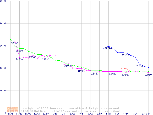 | [↓次グラフ]: | 2.5インチHDD 80GB以上(9.5mm厚)の最安値推移 |