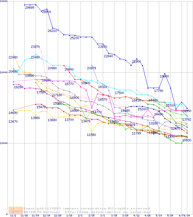 HDD主要製品(最安値1万5千円~2万円未満)の最安値推移