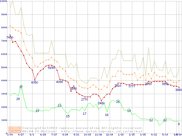 PC133 SDRAM DIMM CasLatency=2の最安値推移