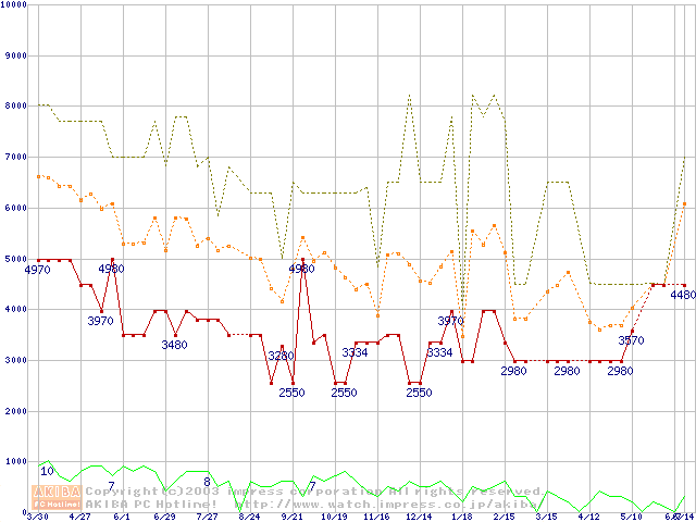 PC133 SDRAM DIMM CasLatency=3 ECC対応の最安値推移
