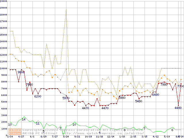 PC133 SDRAM DIMM CasLatency=3 ECC対応の最安値推移