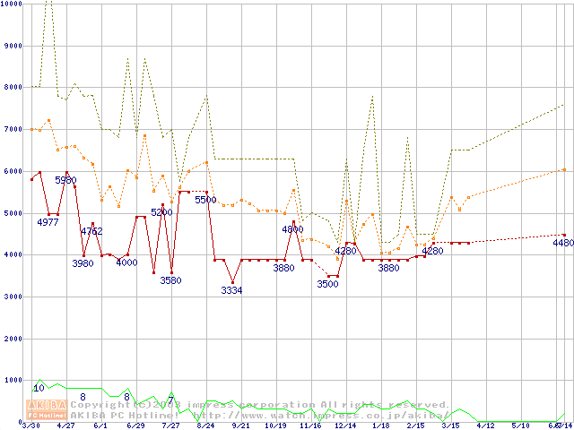 PC100 SDRAM DIMM CasLatency=2 ECC対応の最安値推移