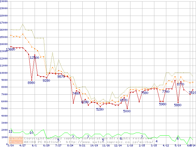 PC100 SDRAM DIMM CasLatency=2の最安値推移