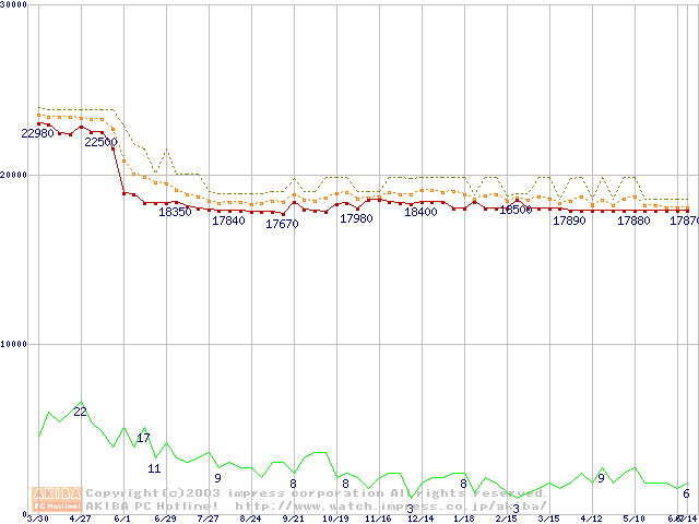 Socket 370 (FC-PGA2,FSB 133MHz,L2 512KB,Tualatin)の最安値推移