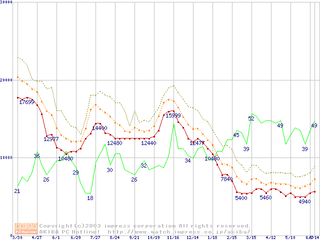 PC2700(DDR333) DDR SDRAM DIMMの最安値推移