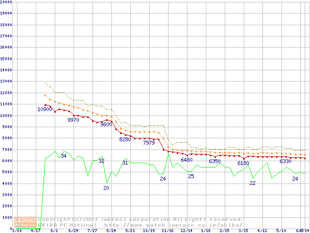 Socket 478 (micro-PGA,FSB 400MHz,L2 128KB,Willamette)の最安値推移