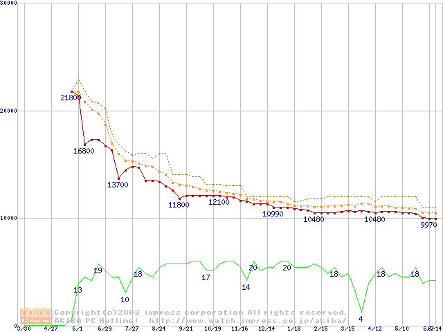 Travelstar 40GNX (9.5mm,5400rpm,UltraATA/100,8MB,FDB,20GB/Platter)の最安値推移