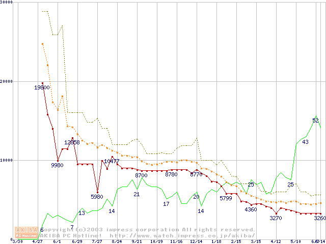 PC3200(DDR400) DDR SDRAM DIMMの最安値推移