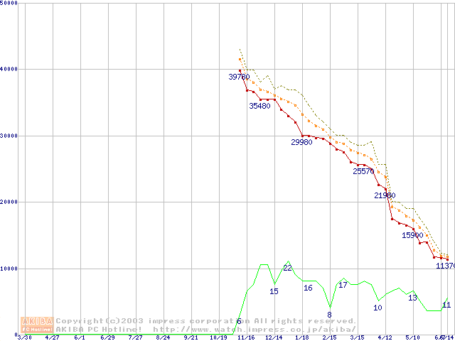 Socket A (OPGA,FSB 333MHz,L2 256KB,Thoroughbred)の最安値推移