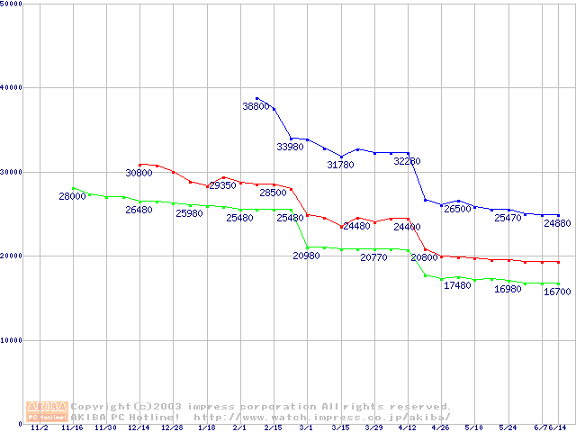 | [↓次グラフ]: | Socket A (OPGA,FSB 266MHz,L2 256KB,Palomino)の最安値推移 |
