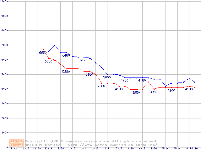 | [↓次グラフ]: | Deskstar 180GXP (7200rpm,8MB,UltraATA/100,FDB)の最安値推移 |