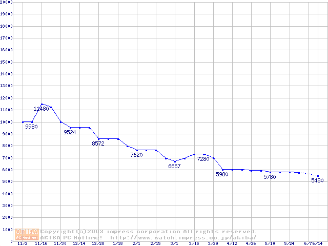 | [↓次グラフ]: | PC2100(DDR266) DDR SDRAM DIMM ECC対応の最安値推移 |