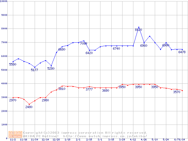 | [↓次グラフ]: | PC133 SDRAM DIMM CasLatency=3 ECC対応の最安値推移 |