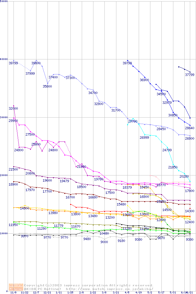2.5インチHDD主要製品(最安値1万円未満)の最安値推移