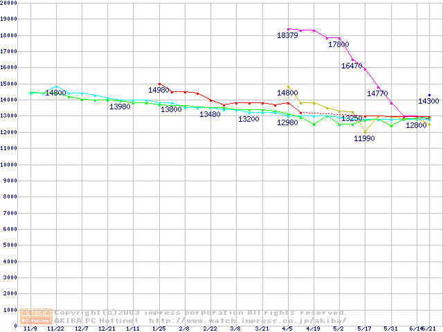 | [↑前グラフ]: | 2.5インチHDD 30GB~40GB未満(9.5mm厚)の最安値推移 |