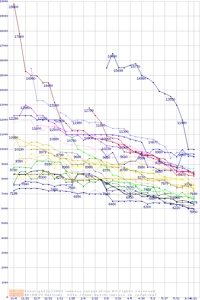 HDD主要製品(最安値1万円~1万5千円未満)の最安値推移