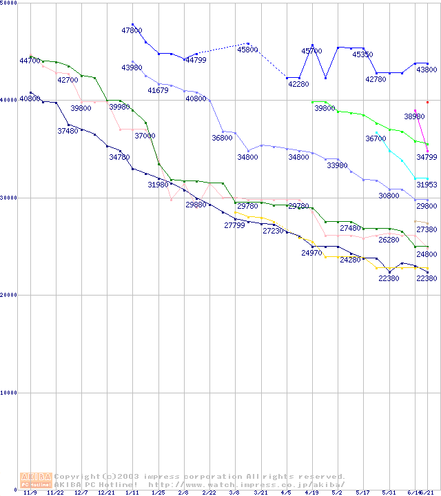 HDD主要製品(最安値1万5千円~2万円未満)の最安値推移