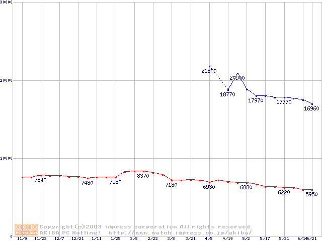 | [↑前グラフ]: | HDD 100GB以上(5400rpmクラス)の最安値推移 |