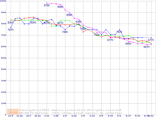 | [↓次グラフ]: | HDD 60GB~80GB未満(5400rpmクラス)の最安値推移 |