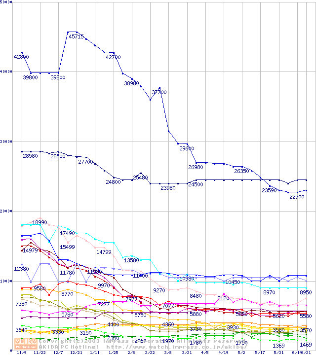 メモリ主要製品の最安値推移