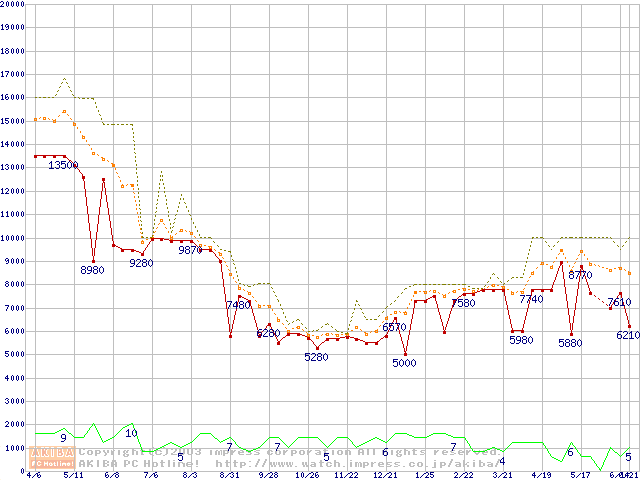 PC100 SDRAM DIMM CasLatency=2の最安値推移