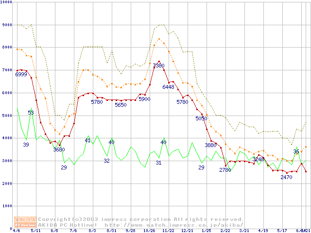 PC2100(DDR266) DDR SDRAM DIMM(CL 2.5)の最安値推移