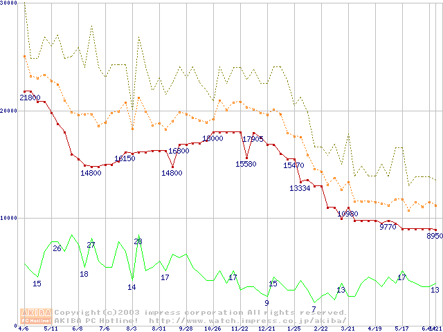 PC2100(DDR266) DDR SDRAM DIMM ECC対応 Registeredタイプの最安値推移