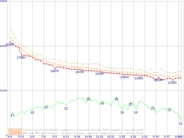 Travelstar 40GN (9.5mm,4200rpm,UltraATA/100,2MB,FDB,20GB/Platter)の最安値推移