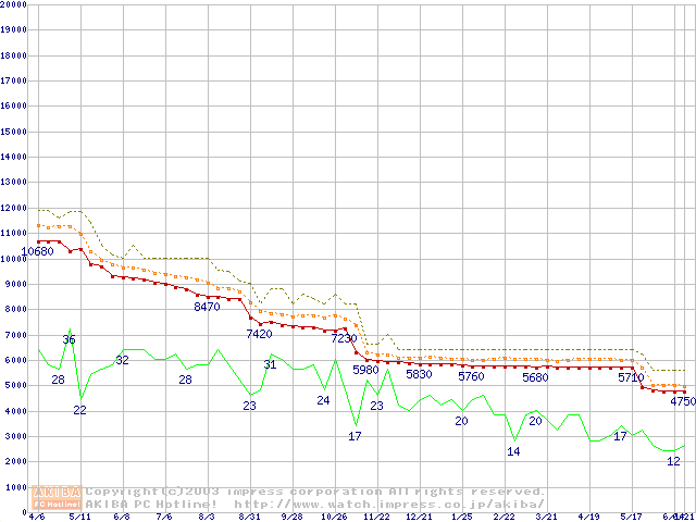 Socket 370 (FC-PGA2,FSB 100MHz,L2 256KB,Tualatin)の最安値推移