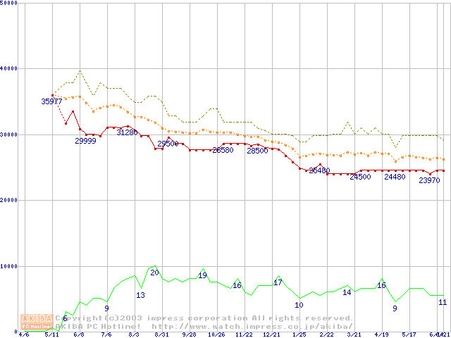 メモリ主要製品(最安値1万円以上)の最安値推移