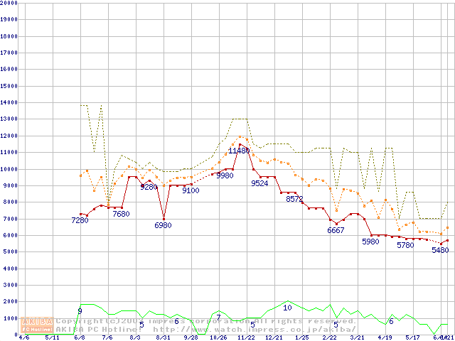 PC2100(DDR266) DDR SDRAM DIMM(CL 2.0) ECC対応 Registeredタイプの最安値推移