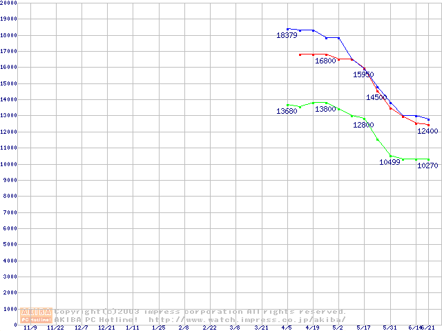 | [↑前グラフ]: | Travelstar 80GN (9.5mm,4200rpm,UltraATA/100,8MB,FDB,40GB/Platter)の最安値推移 |