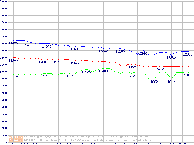 | [↑前グラフ]: | Travelstar 80GN (9.5mm,4200rpm,UltraATA/100,2MB,FDB,40GB/Platter)の最安値推移 |