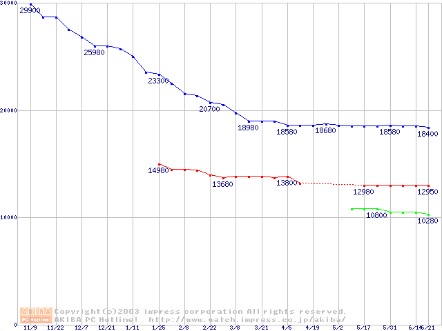 | [↑前グラフ]: | MKシリーズ (9.5mm,4200rpm,2MB,FDB,40GB/Platter)の最安値推移 |