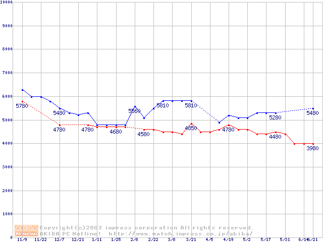 | [↓次グラフ]: | Socket 370 (PPGA,FSB 66MHz,L2 128KB,Mendocino)の最安値推移 |