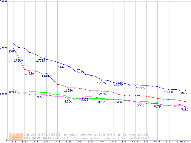 | [↑前グラフ]: | Deskstar 180GXP (7200rpm,8MB,UltraATA/100,FDB)の最安値推移 |