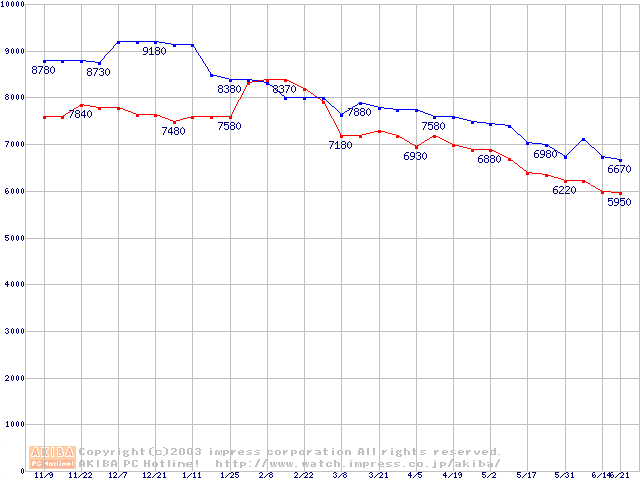 | [↑前グラフ]: | DiamondMax Plus 9 (7200rpm,2MB,UltraATA/133,FDB)の最安値推移 |