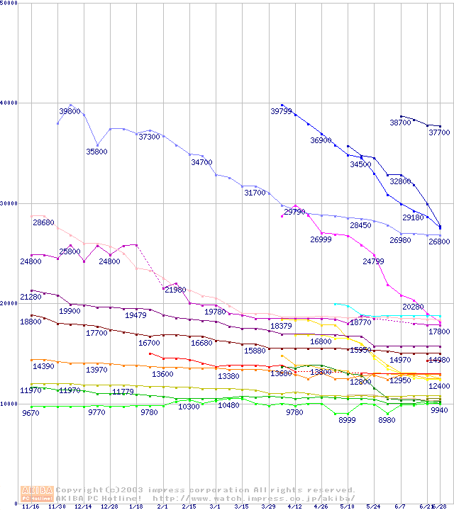 2.5インチHDD主要製品(最安値1万円未満)の最安値推移