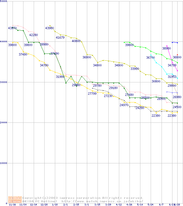 HDD主要製品(最安値1万5千円~2万円未満)の最安値推移