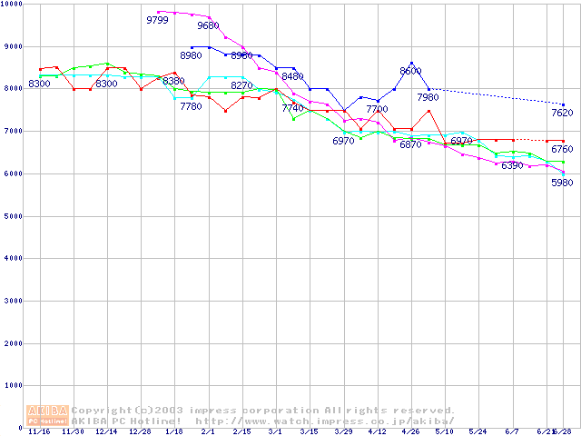 | [↓次グラフ]: | HDD 60GB~80GB未満(5400rpmクラス)の最安値推移 |