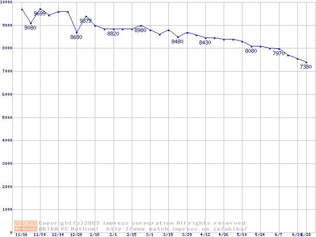 | [↓次グラフ]: | HDD 80GB~100GB未満(5400rpmクラス)の最安値推移 |