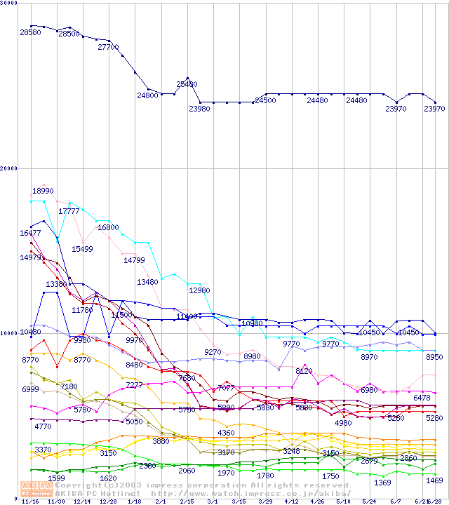 メモリ主要製品(最安値1万円以上)の最安値推移