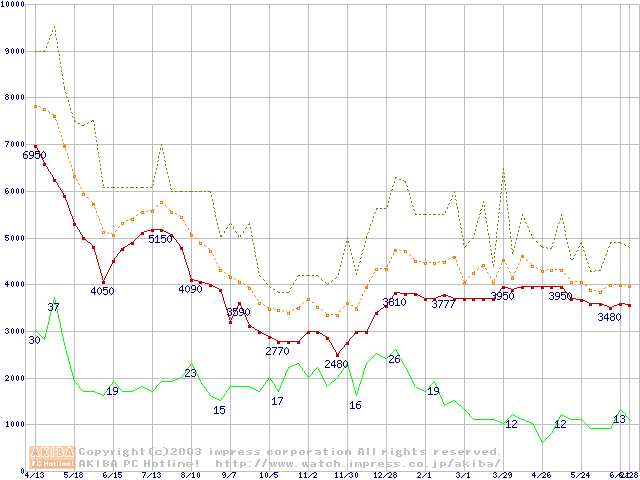 PC133 SDRAM DIMM CasLatency=2の最安値推移