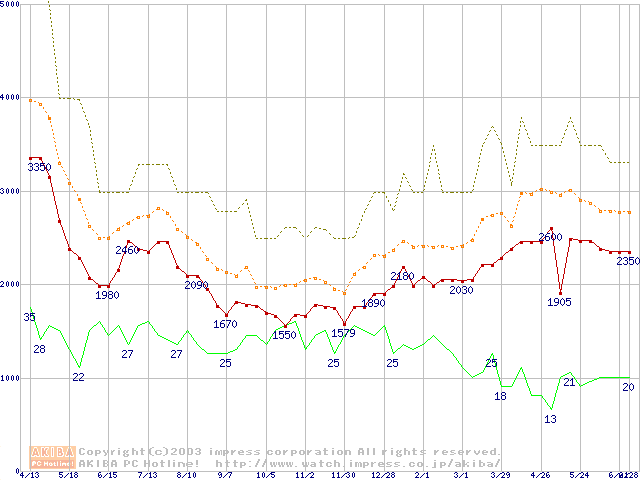 PC100 SDRAM DIMM CasLatency=2の最安値推移