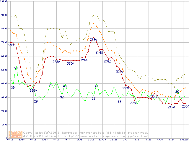メモリ主要製品の最安値推移